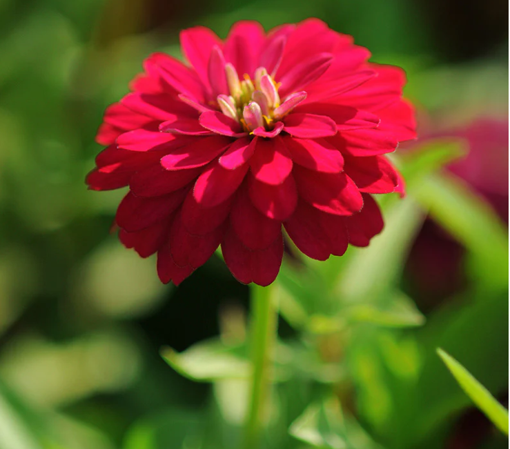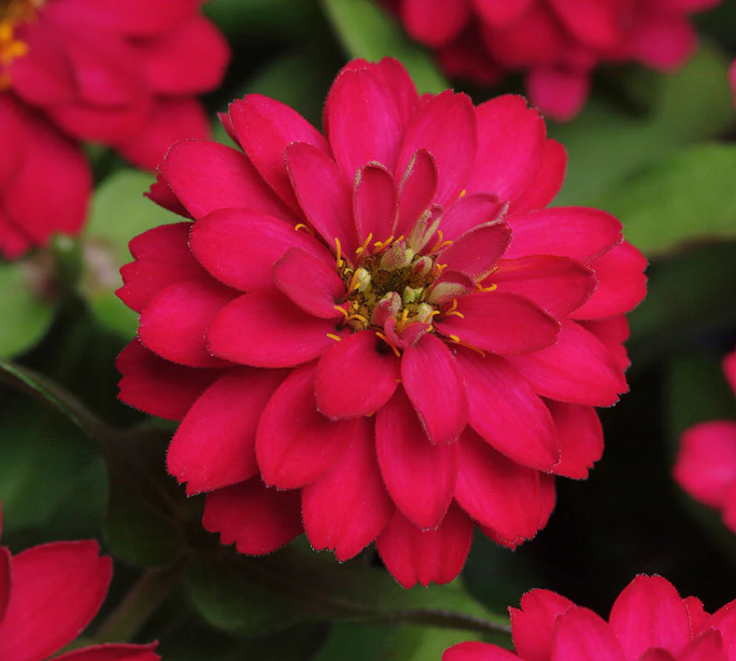 Cinnija Zahara Double Cherry ziedi ir tumši ķiršu sarkani ar neona rozā nokrāsu, dubultā forma. Stingri ziedkāti. Šķirne populāra ar to, ka ir izturīga pret dažādiem laikapstākļiem (piem, pārmēru lielu sausumu vai mitrumu, karstumu). Laba slimībizturība, it sevišķi pret miltrasu. Zied bagātīgi un nepārtraukti. Nektārraugs – pievilina kukaiņus, taureņus. Izstāda ārā pēc salnām barības vielām bagātā un labi drenetā augsnē, saulainā vietā. Viegli audzējama, piemērota arī iesācējiem.